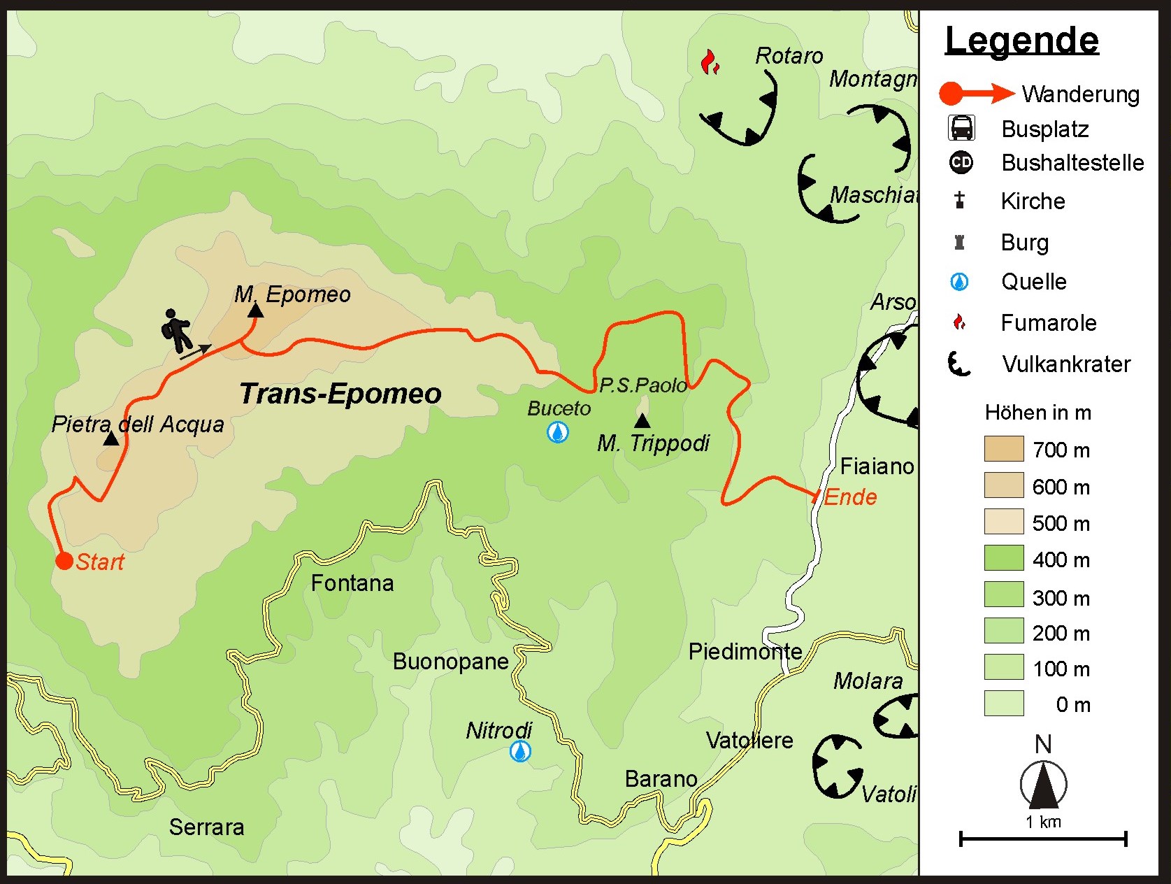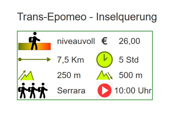 Der Transferbus bringt uns zu unserem Startpunkt oberhalb des Bergdorfes Serrara in ca. 500m Höhe. Unser Aufstieg beginnt mit einem Panoramaweg, der uns einen atemberaubenden Ausblick auf Forio ermöglicht. Durch ein Felsenmeer hindurch und vorbei an interessanten Gesteinsformationen erreichen wir „Pietra dell‘Acqua“. Der Wanderweg führt uns schließlich über einen breiten Bergkamm zum Epomeo. Auf seinem Gipfel in 789m Höhe werden wir mit einen wunderbaren 360° Rundumblick belohnt. Nach einer ausgiebigen Mittagspause im Gipfelrestaurant wandern wir weiter über den grünen, bewaldeten Höhenrücken in das Einzugsgebiet der Süßwasserquelle „Buceto“. Dieses schon seit dem Altertum genutzte Wasserreservoir liegt in ca. 400 m Höhe im Bereich von ehemaligen Strandterrassen, deren Böden noch immer feinen Meeressand aufweisen. Wir passieren die schöne, stille Hochebene von Piano San Paolo mit einem Platz für urige Waldfeste. An Baumerika, Farnmeeren und Ginster vorbei und durch Terrassen mit