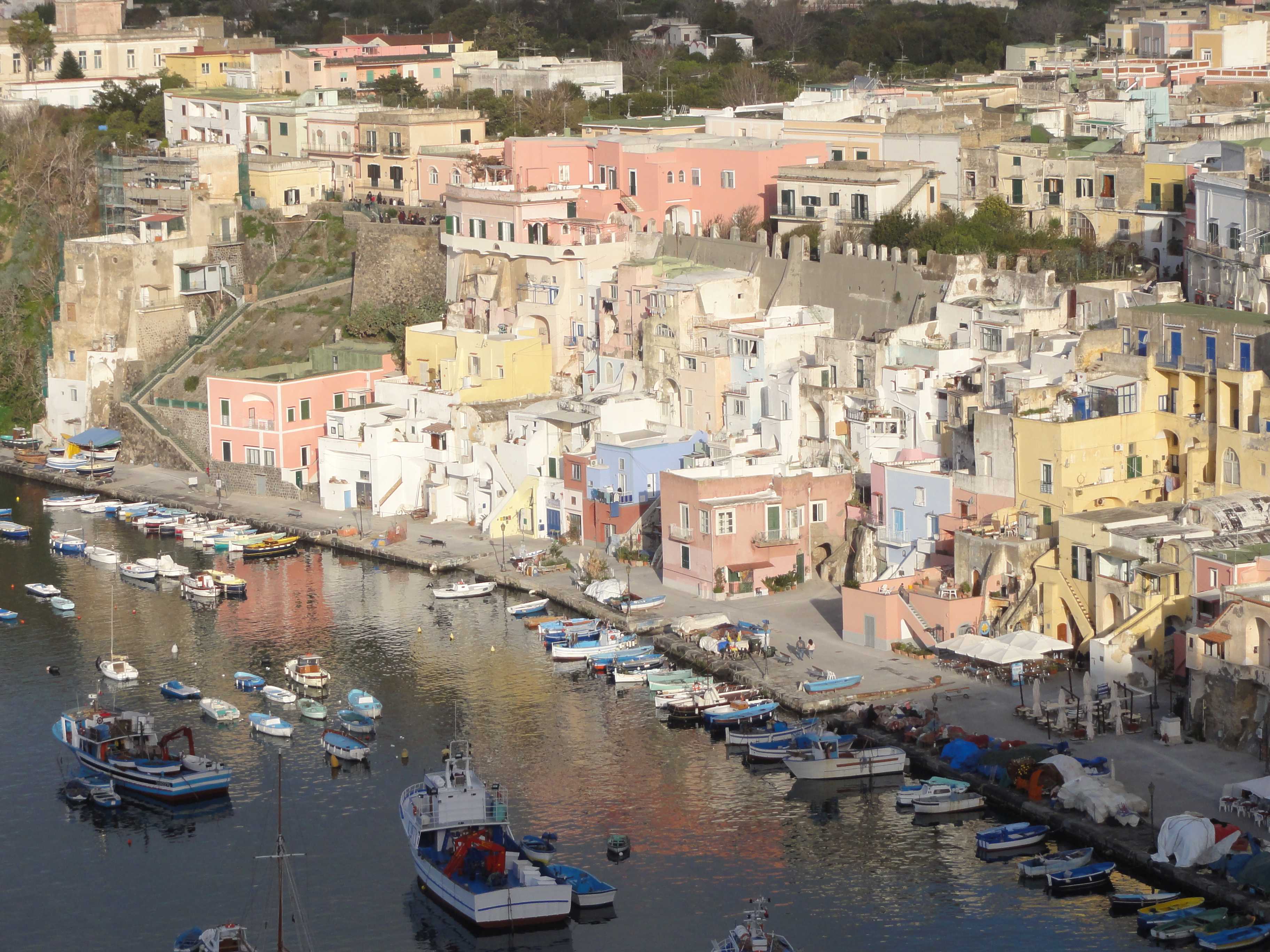 Von hier aus genießen wir die wunderbaren Aussichten und gehen zu einem romantischen Fischerhafen, zur Marina di Corricella.