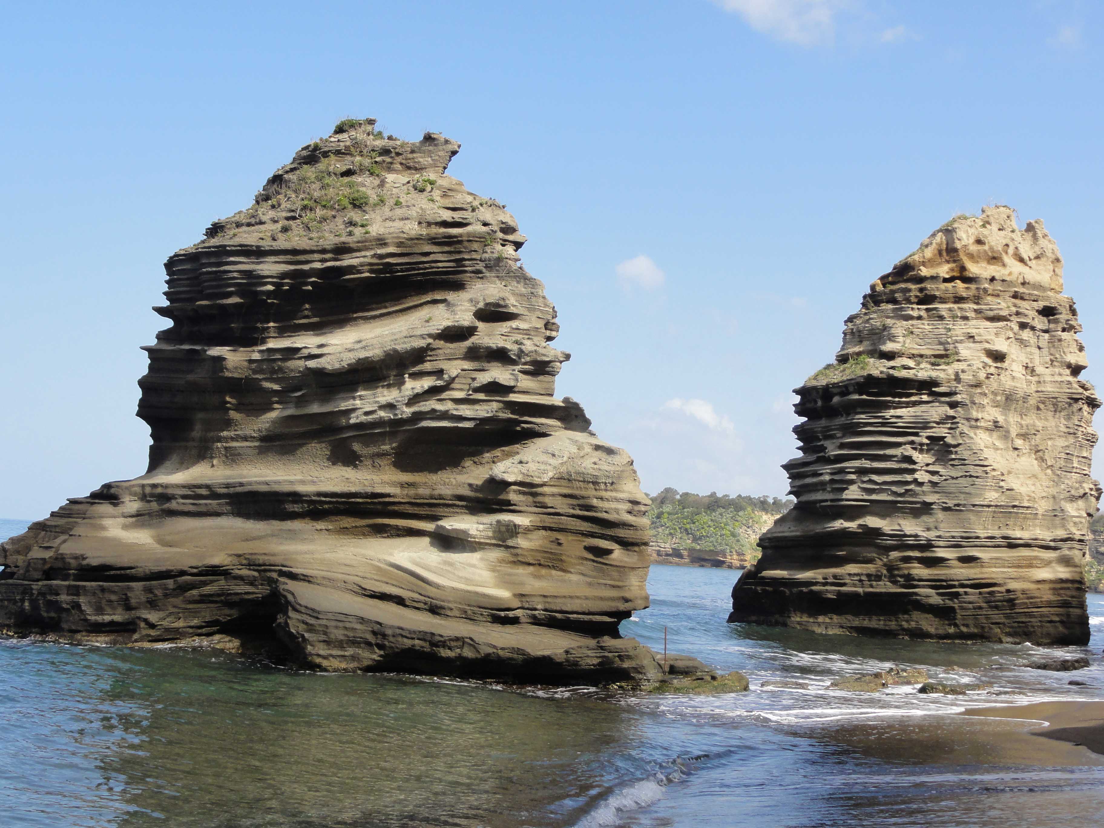 Dabei passieren wir Steilküsten, die aus Schichten vulkanischen Materials aufgebaut